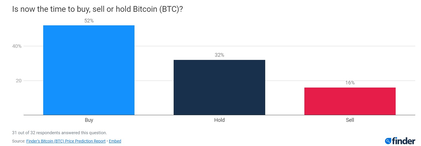 즉, 파인더 패널의 52%는 지금이 비트코인을 사기에 좋은 시기라고 생각하는 반면, 32%는 보유를 제안한다. 이 스펙트럼의 반대쪽에는 시가총액 기준으로 가장 큰 디지털 자산을 판매할 것을 권장하는 패널의 16%가 있다.