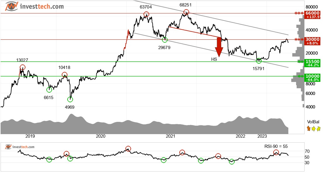 비트코인은 중장기적으로 상승 추세 채널에 있다. 상승 추세는 통화가 긍정적인 발전을 경험하고 투자자들 사이에서 매수 관심이 증가하고 있다는 것을 나타낸다. 통화는 25000 지점에서 지지를 받고 30600 지점에서 저항을 받는다. 볼륨 상의와 볼륨 하의는 가격 상의와 하의와 잘 어울린다. 이것은 유행을 강화한다. RSI 곡선은 하락 추세를 보여주는데, 이는 가격에 대해서도 하향 추세 반전 가능성이 있다는 초기 신호이다. 통화는 전반적으로 중기적으로 기술적으로 긍정적인 것으로 평가된다.
