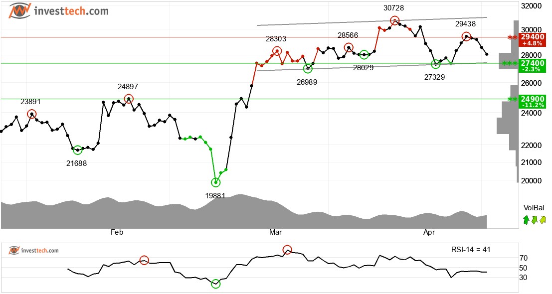 비트코인은 중장기적으로 상승 추세 채널에 있다. 상승 추세는 통화가 긍정적인 발전을 경험하고 투자자들 사이에서 매수 관심이 증가하고 있다는 것을 나타낸다. 통화는 25000 지점에서 지지를 받고 30700 지점에서 저항을 받는다. RSI 곡선은 하락 추세를 보여주는데, 이는 가격에 대해서도 하향 추세 반전 가능성이 있다는 초기 신호이다. 통화는 전반적으로 중기적으로 기술적으로 긍정적인 것으로 평가된다.