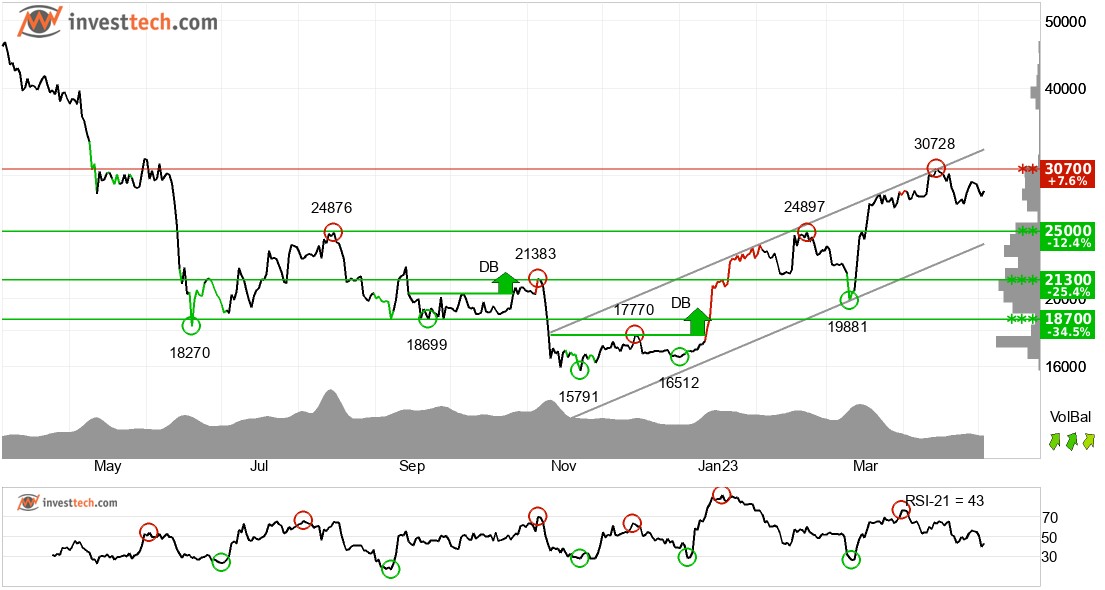 비트코인은 중장기적으로 상승 추세 채널에 있다. 이는 투자자들 사이에서 낙관론이 증가하고 있음을 의미하며 지속적인 상승을 의미한다. 통화는 30700포인트에서 저항선에 접근하고 있으며, 이는 부정적인 반응을 줄 수 있다. 다만 30700포인트를 돌파하는 것은 긍정적인 신호가 될 것이다. RSI 곡선은 하락 추세를 보여주는데, 이는 가격에 대해서도 하향 추세 반전 가능성이 있다는 초기 신호이다. 통화는 전반적으로 중기적으로 기술적으로 긍정적인 것으로 평가된다.