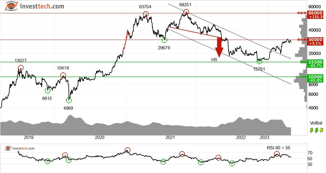 비트코인은 장기적으로 하락 추세의 상한선을 깼는데, 이는 초기 하락 속도가 더 느리다는 것을 의미한다. 가격은 머리와 어깨 형성이 중단된 후 반응했다. 31687을 중심으로 저항이 있어 이제 좋은 판매 기회를 열어주고 있다. 이 저항이 결정적으로 끊어지면 음극 신호가 중화됩니다. 통화는 30000 지점에서 저항을 테스트하고 있다. 이것은 부정적인 반응을 줄 수 있지만, 포인트 30000의 상향 돌파는 긍정적인 신호를 의미한다. RSI는 가격에 대해 부정적인 차이를 보이며, 이는 하향 반응의 위험을 나타낸다. 통화는 전반적으로 장기적으로 기술적으로 마이너스로 평가된다.