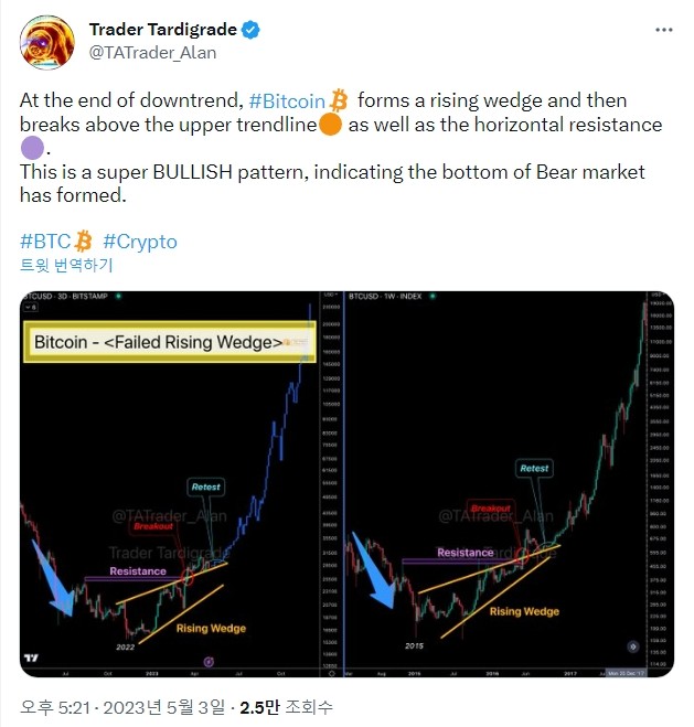 거래 전문가의 게시물에는 암호화폐가 같은 패턴을 형성한 2015년 비트코인 차트도 포함돼 있는데, 이후 큰 폭의 상승세가 이어졌다.