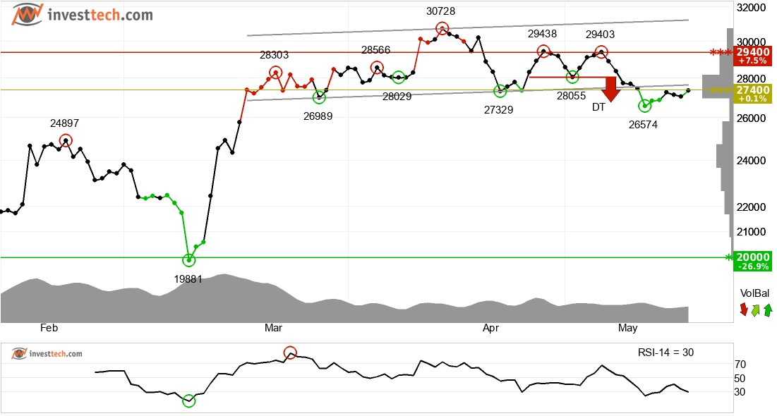 비트코인은 투자자들이 그 어느 때보다 낮은 가격에 매각한 후 단기적으로 대략적인 수평적 추세 채널에서 붕괴되었다. 부정적인 신호가 트리거되었으며 통화의 추가 하락이 표시됩니다. 통화는 더블탑 형성이 중단된 후 26754로 목표를 달성했다. 지금은 가격이 다시 올랐지만 형성은 더 하락할 것을 나타낸다. 통화는 27400 지점에서 저항을 테스트하고 있습니다. 이것은 부정적인 반응을 줄 수 있지만, 27400점의 상향 돌파는 긍정적인 신호를 의미한다. 통화의 단기 모멘텀은 RSI가 30 이하로 강력하게 부정적이다. 이는 투자자들의 비관론이 커지고 비트코인에 대한 추가 하락을 의미한다. 다만 특히 대형주의 경우 낮은 RSI는 해당 종목이 과매도 상태이며 상승반등 가능성이 있다는 신호일 수 있다. 통화는 전반적으로 단기적으로 기술적으로 마이너스로 평가된다.