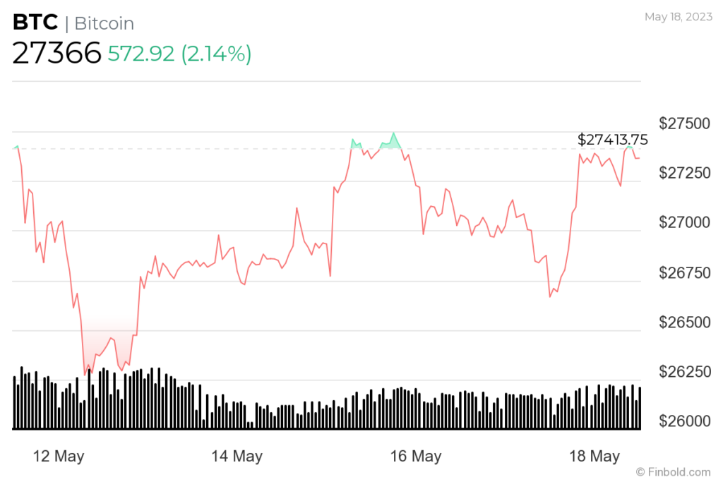 한편 핀볼드가 지난 5월 18일 회수한 최신 차트에 따르면 비트코인은 전주 대비 0.44%, 지난달 8.49%의 손실을 반전시키려 해 이날 2.14% 상승한 2만7366달러에 프레스타임 거래됐다.