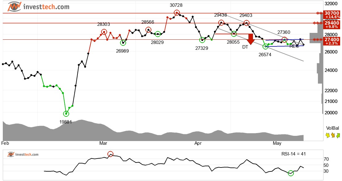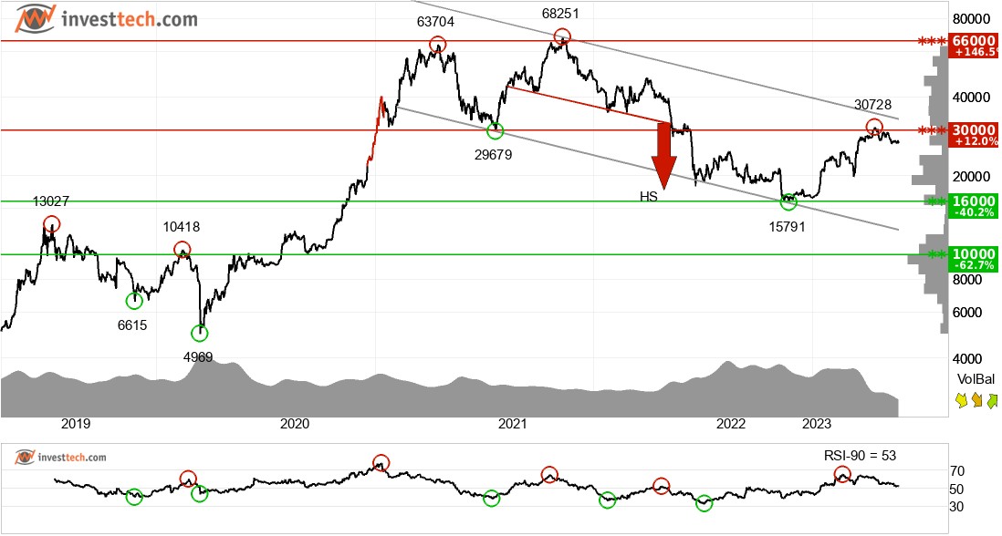 비트코인은 중장기적으로 상승 추세 채널에 있다. 이는 투자자들 사이에서 낙관론이 증가하고 있음을 의미하며 지속적인 상승을 의미한다. 통화는 25000 지점에서 지지를 받고 31000 지점에서 저항을 받는다. RSI 곡선은 하락 추세를 보여주는데, 이는 가격에 대해서도 하향 추세 반전 가능성이 있다는 초기 신호이다. 통화는 전반적으로 중기적으로 기술적으로 약간 긍정적인 것으로 평가된다.