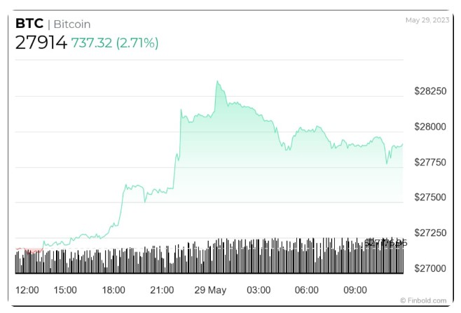 기자회견 시간에 BTC는 이날 2.7% 오른 27.914달러로 손을 바꾸고 있었다. 지난 한 달간 리딩크립토큰은 6월 신규 금리인상 가능성이 높아진다는 투자자들의 우려 등 복합적인 요인으로 4.5% 안팎의 가치가 하락했다.