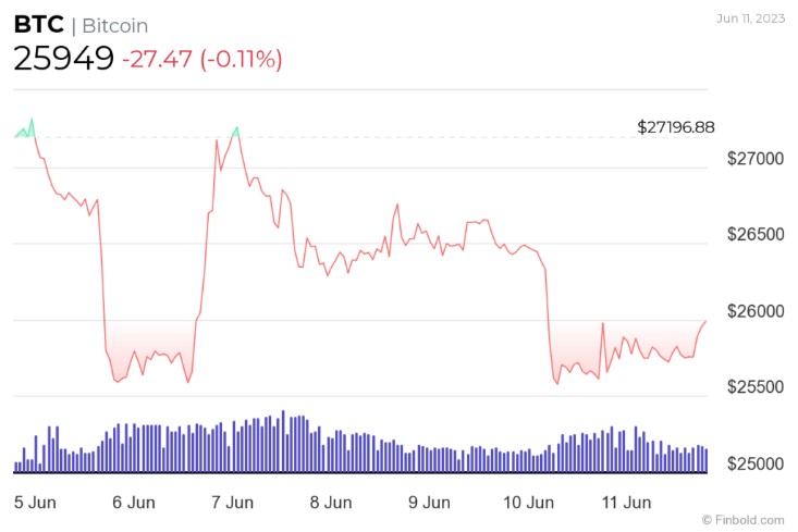 프레스타임 기준으로 비트코인은 주간 약 5%의 손실을 반영하여 25,949달러에 거래되고 있다.