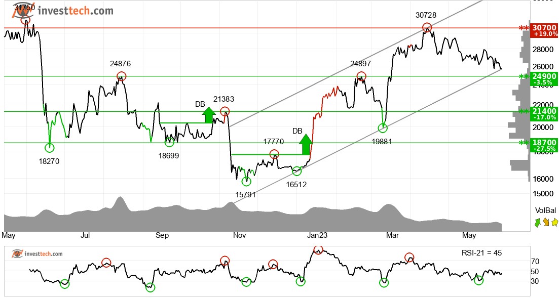 비트코인은 중장기적으로 상승 추세 채널에 있다. 이는 투자자들 사이에서 낙관론이 증가하고 있음을 의미하며 지속적인 상승을 의미한다. 통화는 24900포인트로 지지선에 근접하고 있어 긍정적인 반응을 보일 수 있다. 그러나 24900점을 돌파하는 하향 돌파는 부정적인 신호가 될 것이다. RSI는 가격과 반대로 긍정적으로 나뉘는데, 이는 반응이 상승할 가능성을 나타낸다. 통화는 전반적으로 중기적으로 기술적으로 긍정적인 것으로 평가된다.
