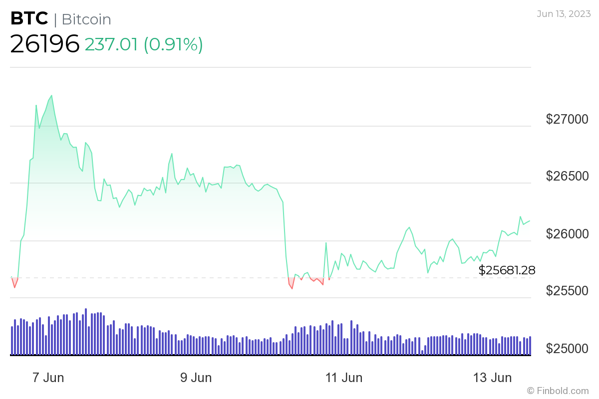 현재 비트코인은 지난 6월 13일 입수한 최근 자료에 따르면 이날 0.91%, 지난 일주일간 1.59% 상승한 26,196달러에 거래되고 있으며 월간 차트에서는 2.44%의 손실을 기록하고 있다.