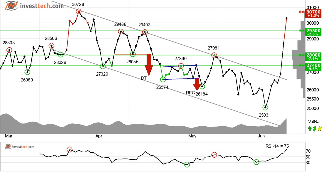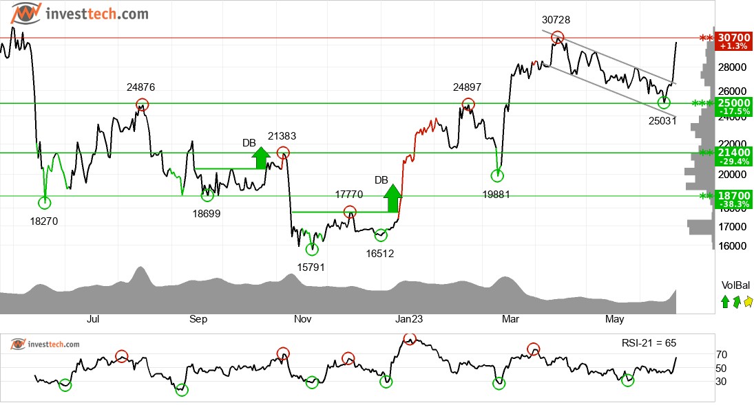 비트코인은 중장기적으로 하락 추세 채널의 천장을 뚫었다. 이는 초기에 하강 속도가 더 느리거나 수평적인 전개가 시작되었음을 나타냅니다. 통화는 저항선을 돌파했고 장기적인 거래 범위에 긍정적인 신호를 주었다. 통화는 30700 지점에서 저항을 테스트하고 있다. 이것은 부정적인 반응을 줄 수 있지만, 30700 지점의 상향 돌파는 긍정적인 신호를 의미한다. 볼륨 밸런스는 긍정적이고 단기적으로 통화를 강화한다. 통화는 전반적으로 중기적으로 기술적으로 중립적인 것으로 평가된다.
