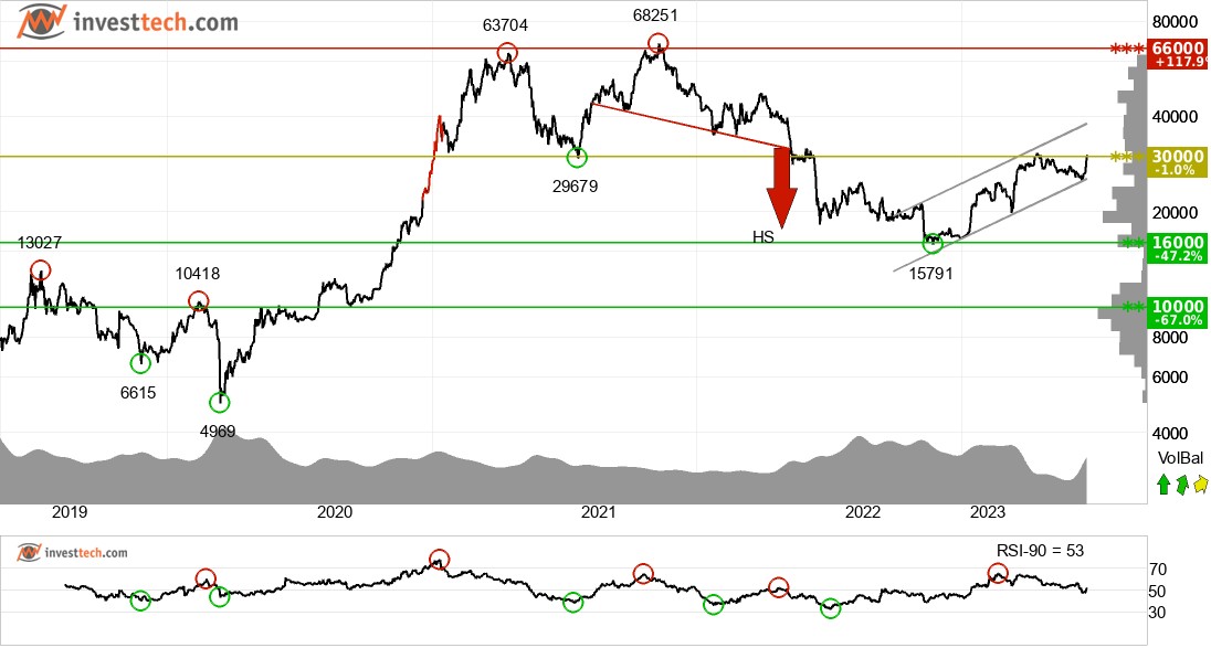 투자자들은 비트코인을 사기 위해 시간이 지남에 따라 더 높은 가격을 지불했고 장기적으로 통화는 상승 추세 채널에 있다. 상승 추세는 통화가 긍정적인 발전을 경험하고 투자자들 사이에서 매수 관심이 증가하고 있다는 것을 나타낸다. 가격은 머리와 어깨 형성이 중단된 후 반응했다. 31687을 중심으로 저항이 있어 이제 좋은 판매 기회를 열어주고 있다. 이 저항이 결정적으로 끊어지면 음극 신호가 중화됩니다. 그 통화는 3만 포인트의 저항으로 약간 붕괴되었다. 확립된 휴식은 추가 상승을 예측한다. 가격이 상승하는 날에는 거래량이 많고 가격이 하락하는 날에는 거래량이 적은 양의 볼륨 밸런스는 단기적으로 통화를 강화한다. RSI는 가격에 대해 부정적인 차이를 보이며, 이는 하락하는 반응의 위험을 나타낸다. 통화는 전반적으로 장기적으로 기술적으로 긍정적인 것으로 평가된다.