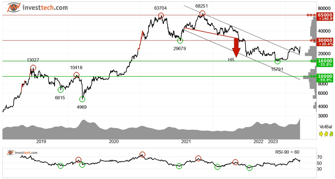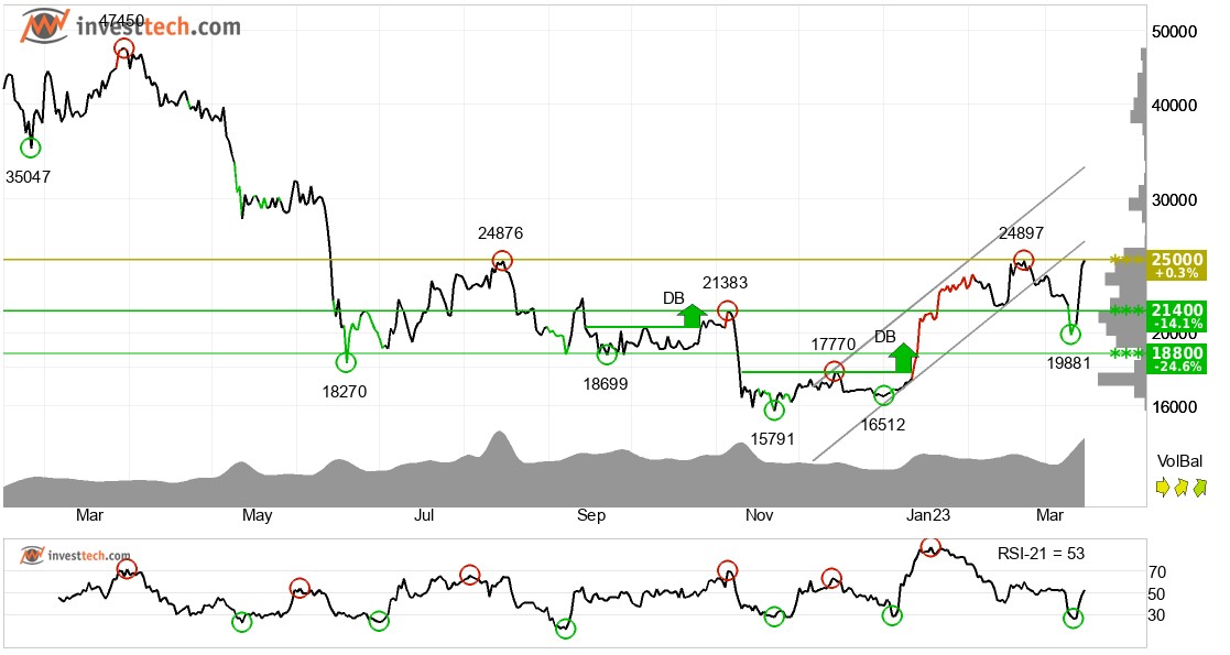 비트코인은 단기적으로 하락하는 추세 채널을 깨고 강한 상승 반응을 보였다. 당분간 향후 추세 방향에 대해서는 뭐라 말하기 어렵다. 통화는 25000 지점에서 저항을 테스트하고 있습니다. 이것은 부정적인 반응을 줄 수 있지만, 25000점의 상향 돌파는 긍정적인 신호를 의미한다. 그 통화는 단기적으로 기술적으로 중립적인 것으로 평가된다.
