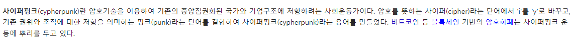사이퍼펑크는 잠재적인 감시 상태에서 개인의 주권을 확보하는 데 필요한 시스템을 구축하는 데 전념하는 암호학자, 컴퓨터 과학자 및 미래학자의 커뮤니티였습니다.