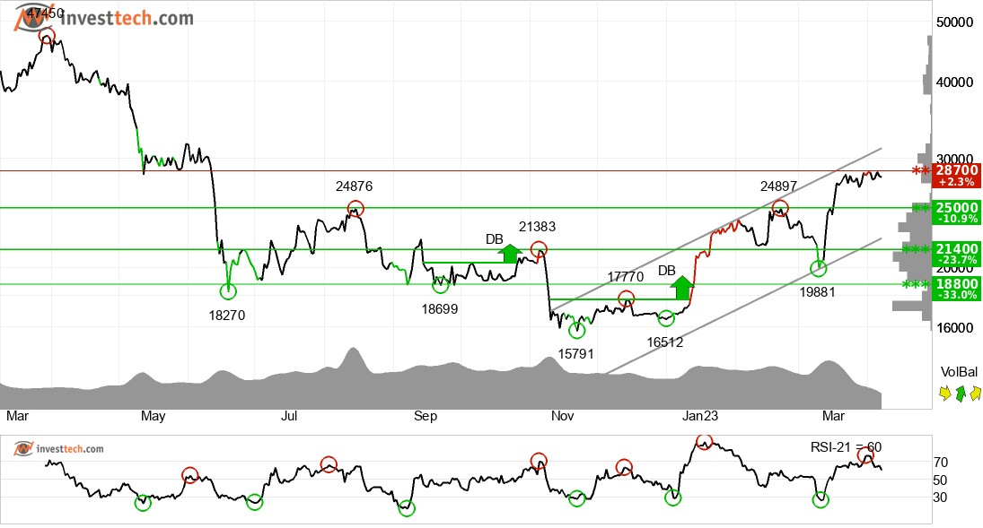 투자자들은 비트코인을 사기 위해 시간이 지남에 따라 더 높은 가격을 지불했고, 통화는 중장기적으로 상승 추세 채널에 있다. 이는 투자자들 사이에서 낙관론이 증가하고 있음을 의미하며 지속적인 상승을 의미한다. 통화는 28700 지점에서 저항을 테스트하고 있다. 이것은 부정적인 반응을 줄 수 있지만, 포인트 28700의 상향 돌파는 긍정적인 신호를 의미한다. 볼륨 상의와 볼륨 하의는 가격 상의와 하의와 잘 어울린다. 볼륨 밸런스도 긍정적이어서 추세를 강화하고 있다. RSI 곡선은 하락 추세를 보여주는데, 이는 가격에 대해서도 하향 추세 반전 가능성이 있다는 초기 신호이다. 통화는 전반적으로 중기적으로 기술적으로 약간 긍정적인 것으로 평가된다.
