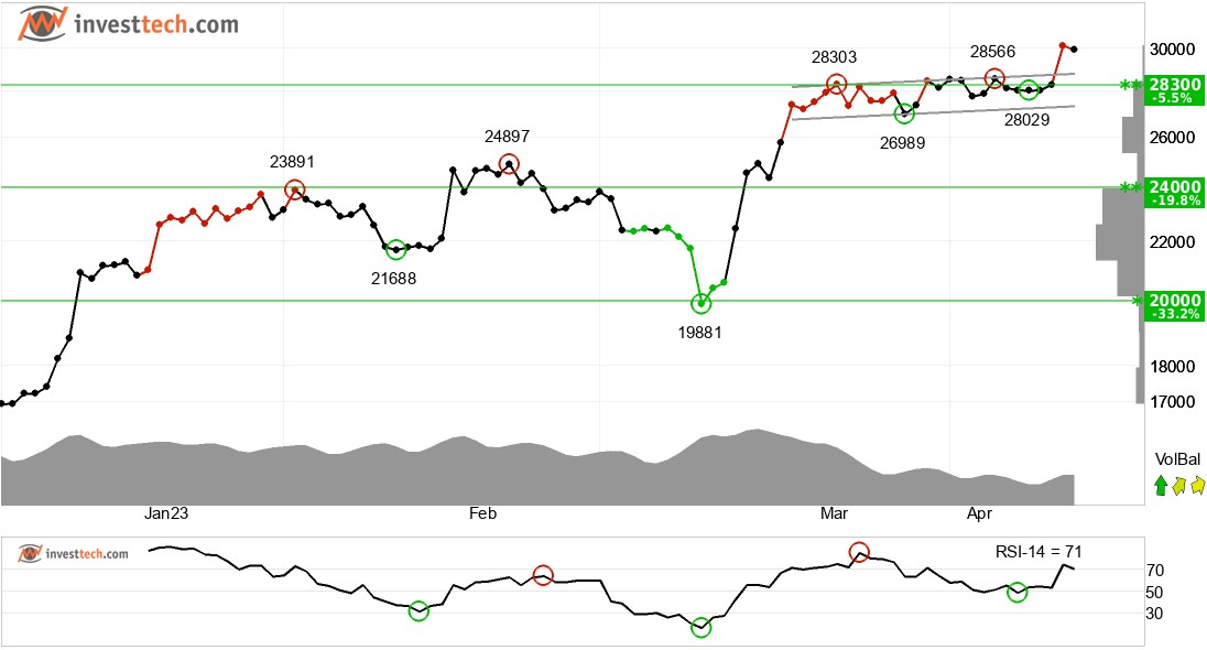 비트코인은 단기적으로 대략적인 수평적 추세 채널에서 벗어났다. 이것은 지속적인 강한 발전을 의미하며, 통화는 이제 추세 채널의 상한선을 향한 가능한 반응에 대한 지지를 충족한다. 가격표에 아무런 저항이 없으며 추가 상승이 표시됩니다. 부정적인 반응이 있을 경우, 통화는 약 28300포인트에서 지지를 받고 있다. RSI는 지난 몇 주간의 좋은 가격 인상 이후 70을 상회한다. 통화는 강한 긍정적인 모멘텀을 가지고 있으며 추가적인 상승이 나타날 것으로 보인다. 다만 특히 대형주의 경우 높은 RSI는 해당 종목이 과잉 매수돼 하락반전 가능성이 있다는 신호일 수 있다. 통화는 전반적으로 단기적으로 기술적으로 긍정적인 것으로 평가된다.