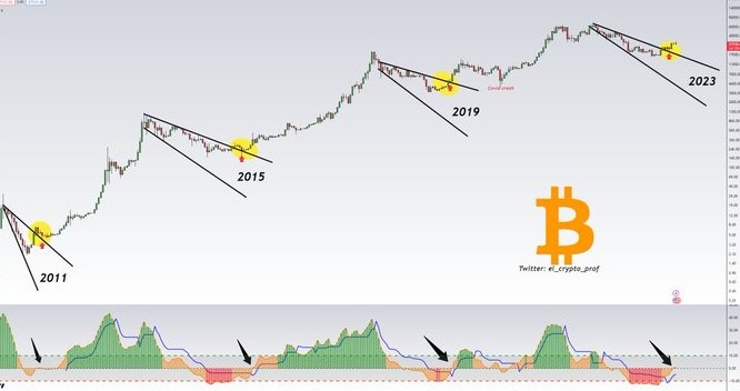 경기 침체에도 불구하고, 익명의 암호화폐 분석가 El_crypto_prof는 4월 23일 트윗에서 손실이 단기적일 수 있음을 시사했다. 분석가에 따르면, 과거 데이터는 그가 스마트 머니 축적의 끝이라고 칭한 것에 이어 비트코인에 대한 잠재적인 강세를 가리키고 있으며, 이는 양적 질적 추정(QQE)이 0을 초과하는 것으로 신호되었다.