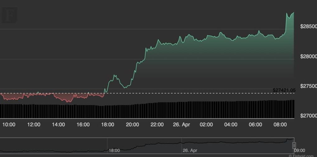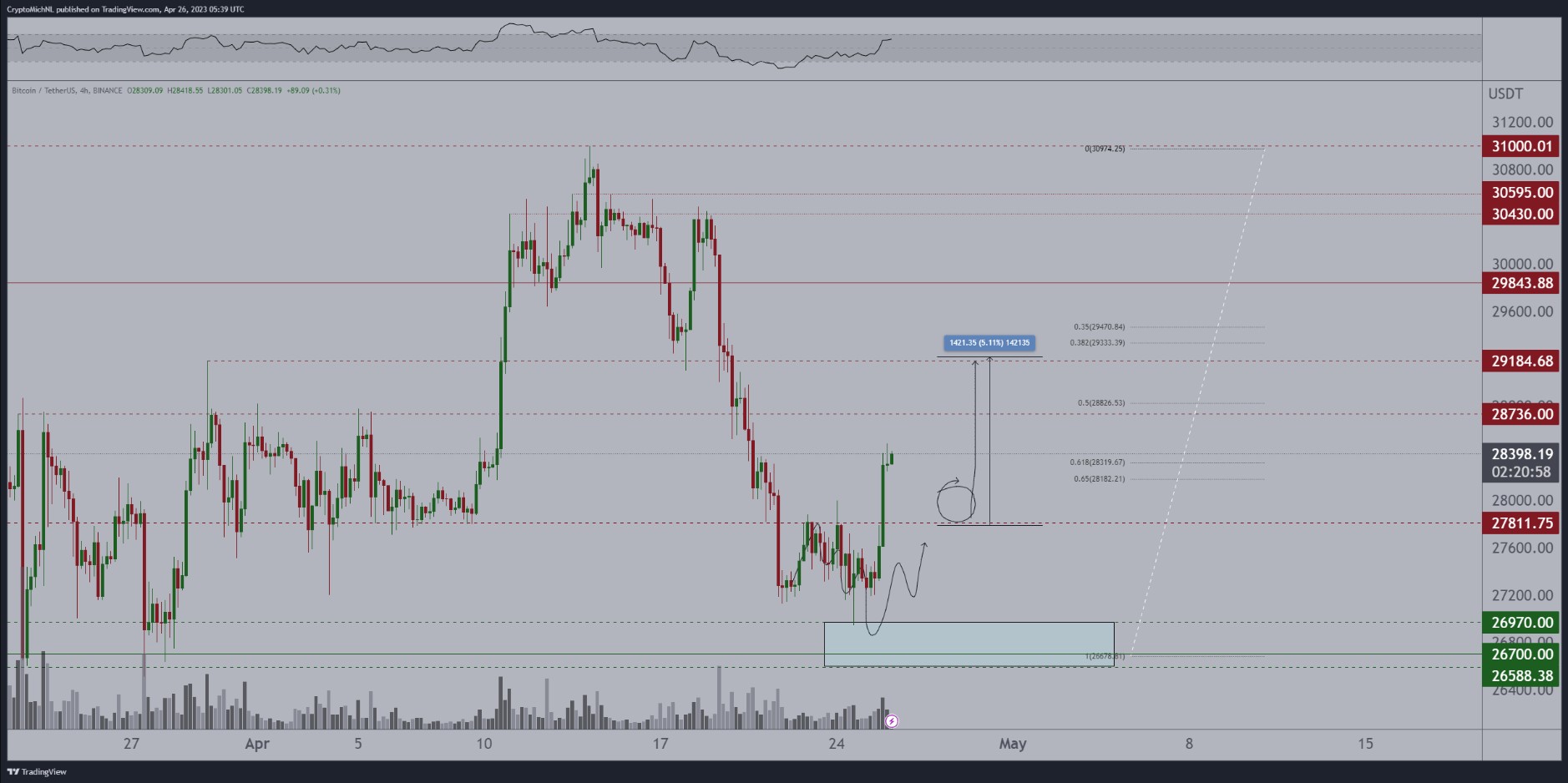 암호 전문가 트레이더 타디그레이드의 4월 26일 분석에 따르면 비트코인은 며칠간의 약세를 보인 후 2만7,000달러대 이상의 견고한 지지를 유지한 후 마침내 약세 흐름에서 벗어났다.