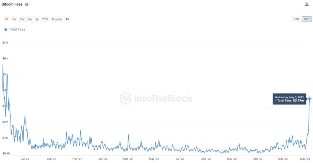 5월 3일 수요일, 비트코인 블록체인에서 지불된 총 수수료 금액은 357만 달러로 4월 말보다 약 400% 증가했다.