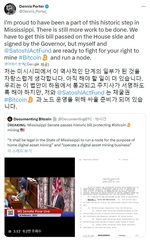 법안은 "미시시피주에서 가정용 디지털 자산 마이닝을 목적으로 노드를 운영하는 것은 합법"이라며 "디지털 자산 마이닝 사업을 운영하는 것은 합법"이라고 명시하고 있다.