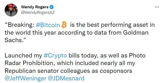 이 의원은 법안 발의를 발표하면서 비트코인이 2023년에 가장 실적이 좋은 자산이라는 거대 은행 골드만삭스의 최근 보고서를 인용했다.