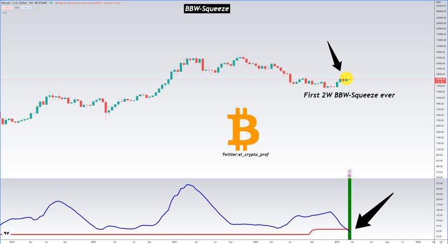 구체적으로, 2주 차트의 볼링거 밴드 폭(BBW) 스퀴즈 지표는 비트코인에 녹색 신호를 준 반면, 1주 차트에서는 가명 암호화폐 분석가인 무스타치가 2월 27일 관찰한 것처럼 처녀 자산 역사상 두 번밖에 발생하지 않았다.