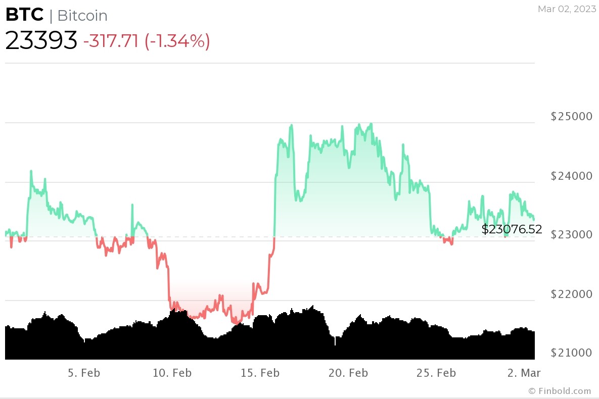현재 비트코인의 가격은 2만 3,393달러로 일일 차트에서 1.34% 하락하고 있으며, 최근 데이터에서 알 수 있듯이 지난 30일 동안 2.42%의 상승률을 기록하면서 3.12%의 손실을 기록하고 있습니다.