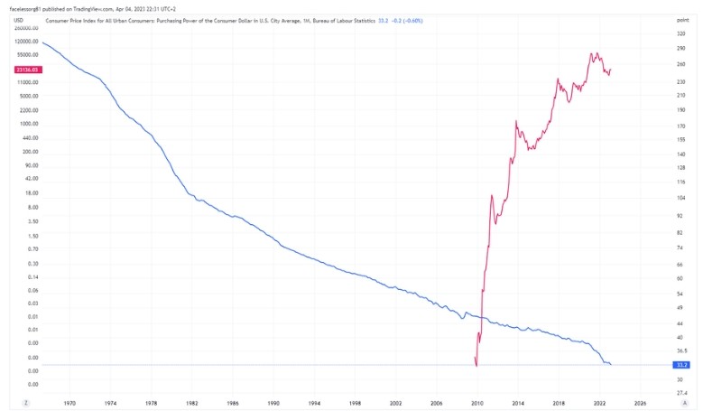 4월 4일 세스로 알려진 금융 분석가가 공유한 비교 차트에 따르면, 공교롭게도 이를 통해 구매할 수 있는 상품과 서비스의 양을 결정하는 미국 달러화의 구매력은 수년간 꾸준히 약화되고 있는 반면 대표적인 분산금융(DeFi) 자산은 2010년 이후 급격히 상승하고 있다.